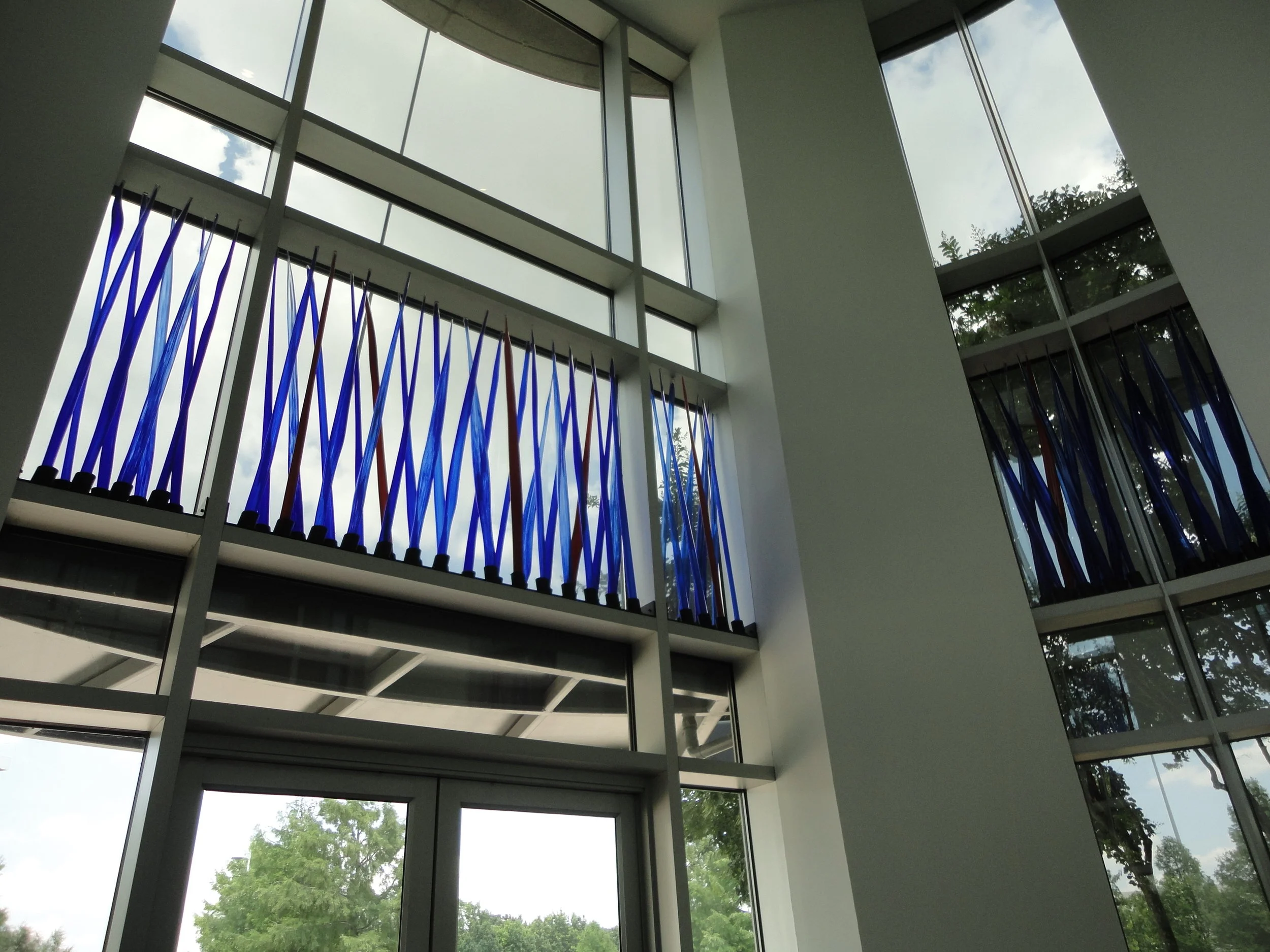 “This piece began as a response to the architectural site, using blown glass, my primary medium at this point in my career. It consists of about 100 lance-like components installed vertically, to create a band of color 24 feet long and 5 feet high in the windows of the rotunda entryway. The predominate color is blue, with red/orange components occurring randomly. The color effect I envision is a field of springtime bluebonnets with a sprinkling of Indian paintbrush.” - Jim Bowman, Artist